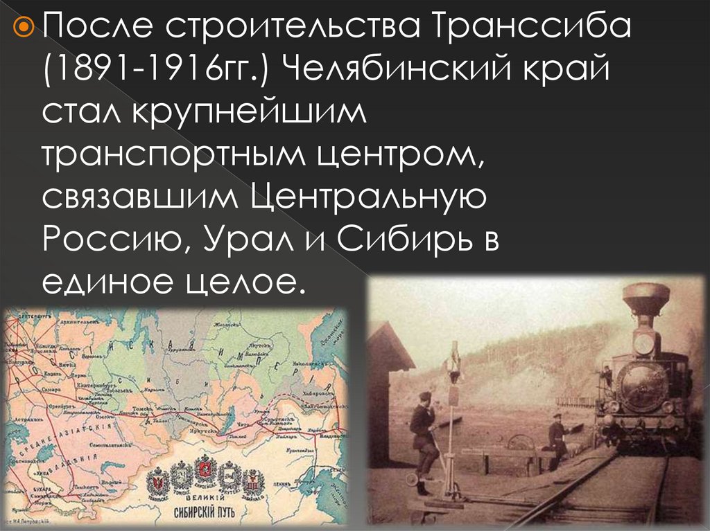 После строительства Транссиба(1891-1916гг.) Челябинский край