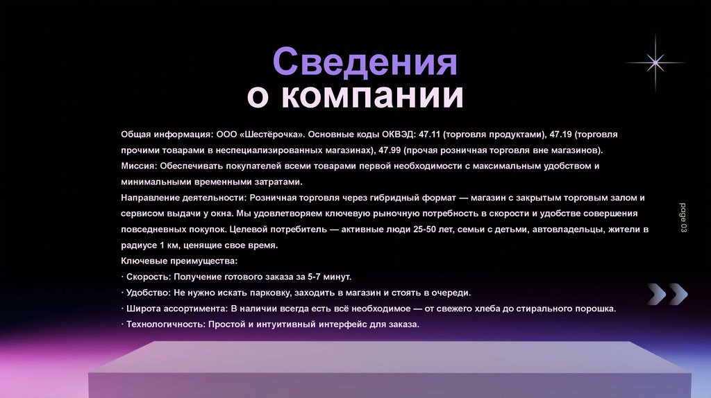 Общая информация: ООО «Шестёрочка». Основные коды ОКВЭД: 47.11 (торговля продуктами), 47.19 (торговля