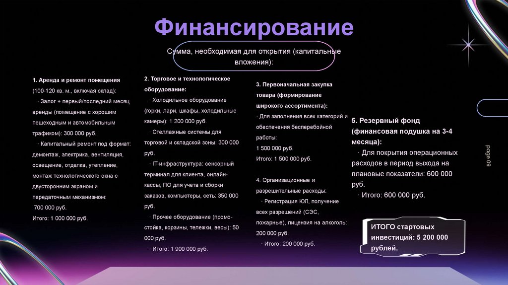 ФинансированиеИТОГО стартовых инвестиций: 5 200 000 рублей.