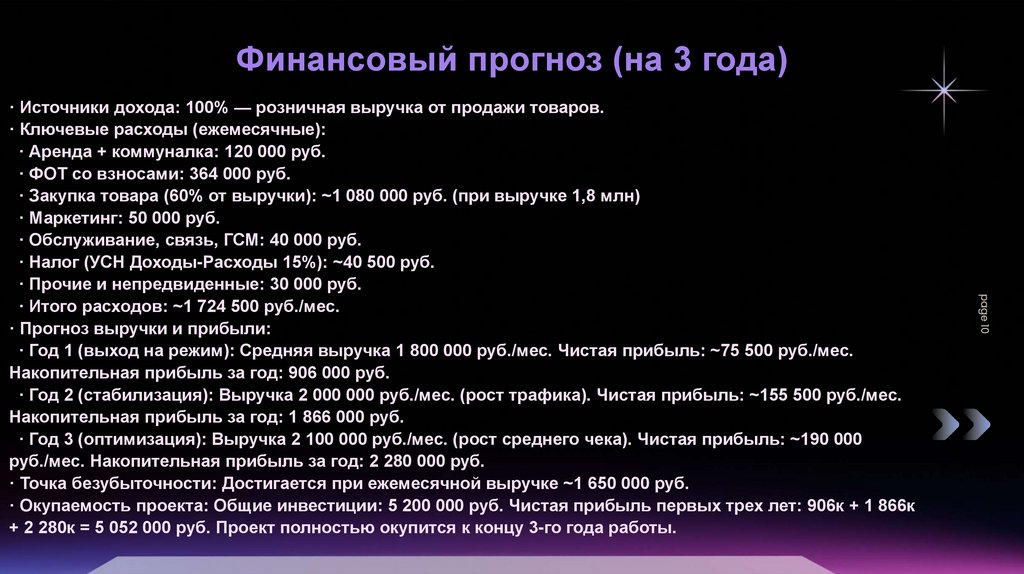Финансовый прогноз (на 3 года)· Источники дохода: 100% — розничная выручка от продажи товаров.