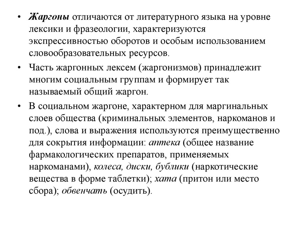 • Жаргоны отличаются от литературного языка на уровнелексики и фразеологии, характеризуются