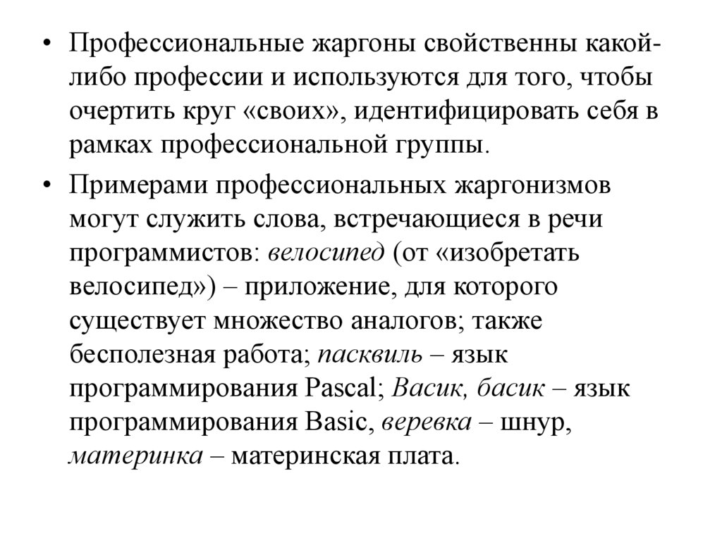• Профессиональные жаргоны свойственны какойлибо профессии и используются для того, чтобыочертить круг «своих», идентифицировать себя в