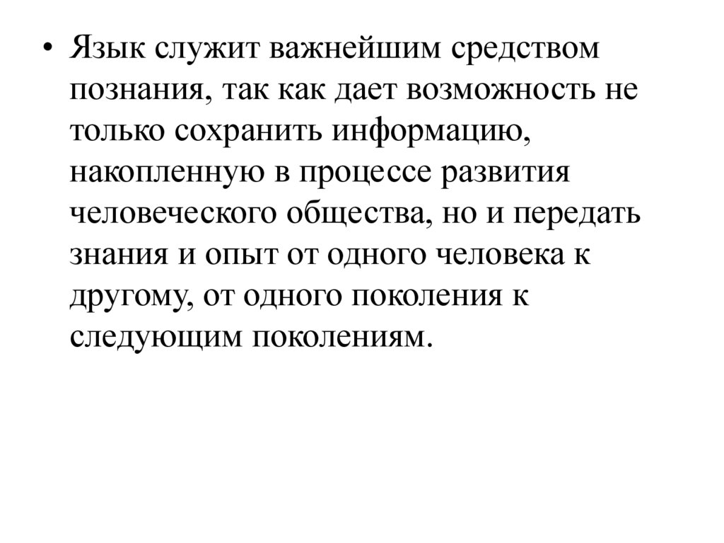 • Язык служит важнейшим средствомпознания, так как дает возможность не