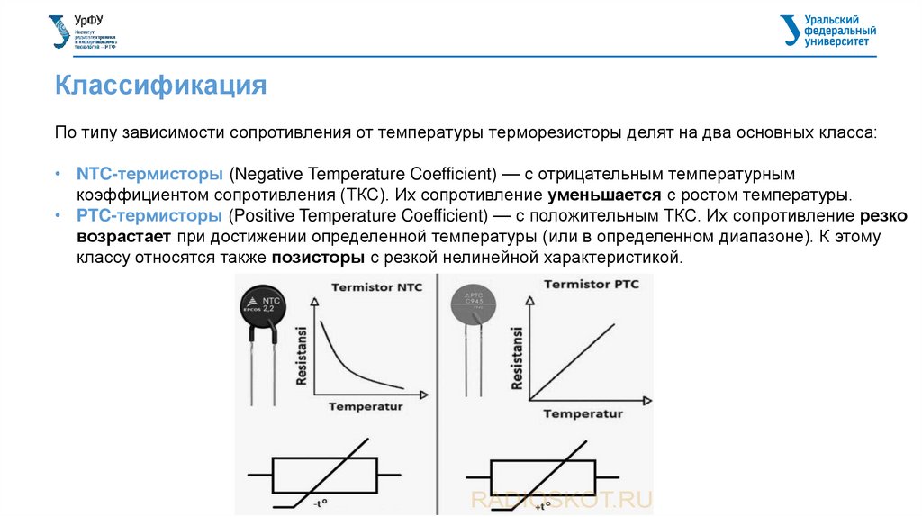 КлассификацияПо типу зависимости сопротивления от температуры терморезисторы делят на два основных класса: