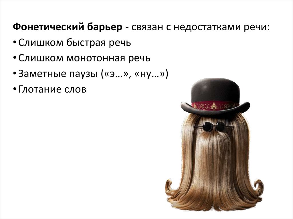 Фонетический барьер - связан с недостатками речи:• Слишком быстрая речь