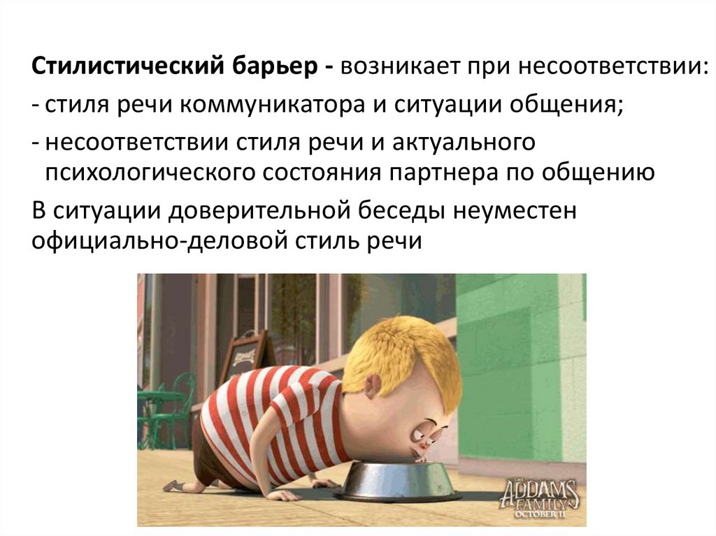 Стилистический барьер - возникает при несоответствии:- стиля речи коммуникатора и ситуации общения;