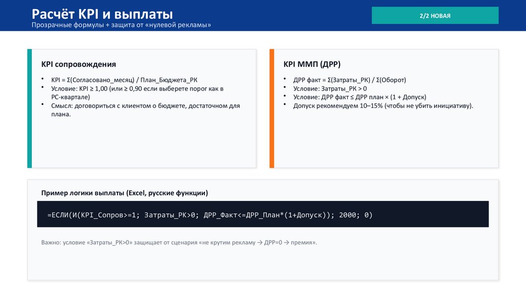 =ЕСЛИ(И(KPI_Сопров>=1; Затраты_РК>0; ДРР_Факт<=ДРР_План*(1+Допуск)); 2000; 0)