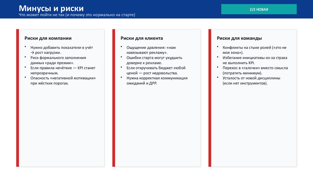 Плюсы / минусы и риски для компании, клиентов и команды.