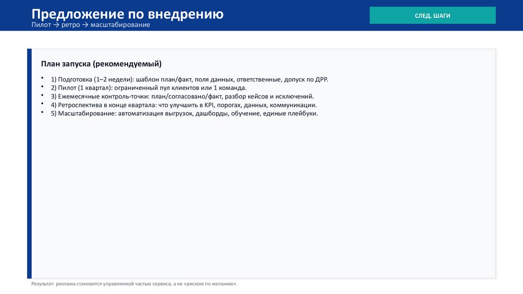 2) Пилот (1 квартал): ограниченный пул клиентов или 1 команда.
