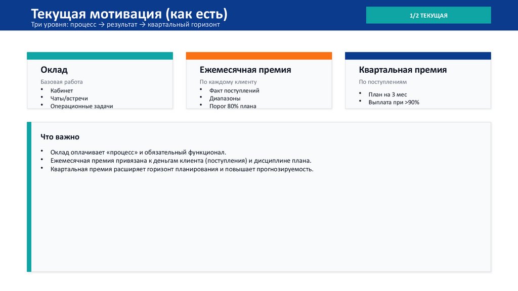Текущая мотивация: оклад, ежемесячная премия, квартальная премия по поступлениям.