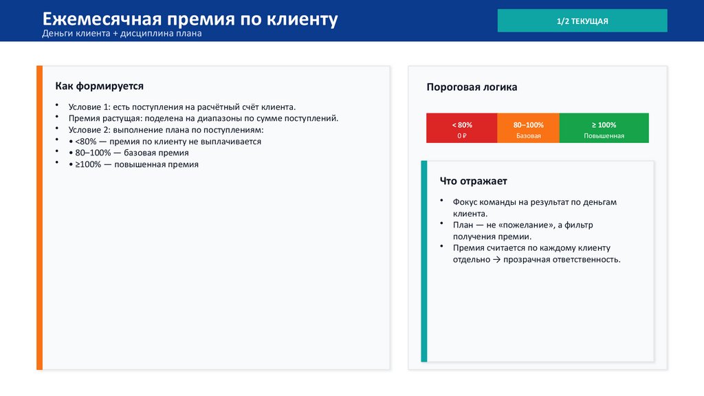 Ежемесячная премия привязана к деньгам клиента (поступления) и дисциплине плана.