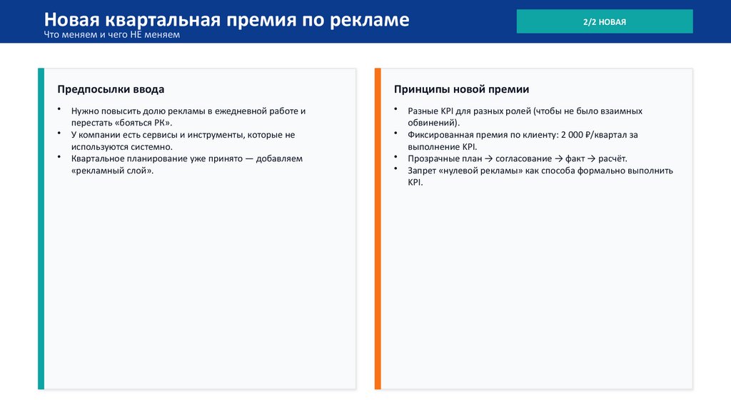 Новая квартальная премия по рекламе: предпосылки, планирование, фиксация факта, расчёт.