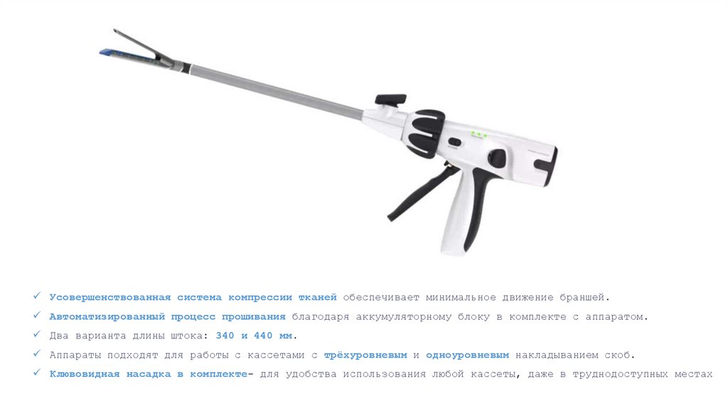 Усовершенствованная система компрессии тканей обеспечивает минимальное движение браншей.Автоматизированный процесс прошивания благодаря аккумуляторному блоку в комплекте с аппаратом.