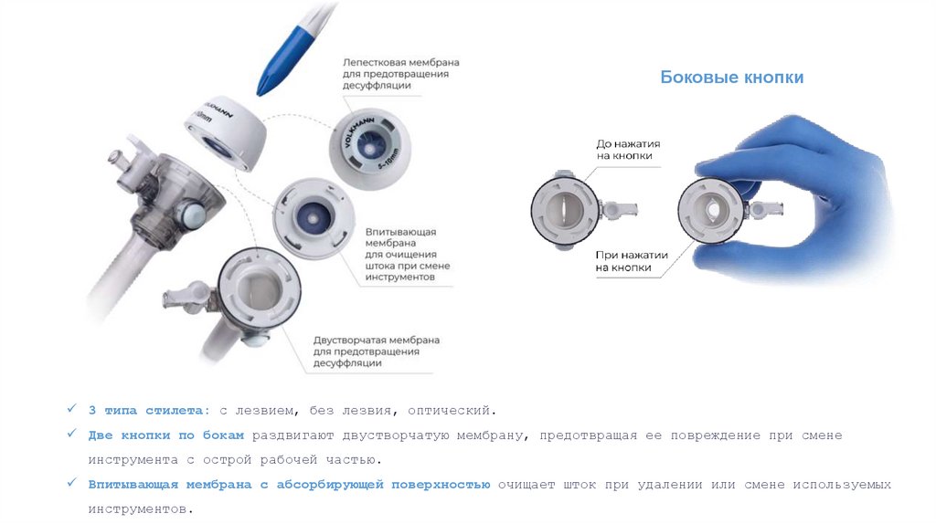 Боковые кнопки3 типа стилета: с лезвием, без лезвия, оптический.