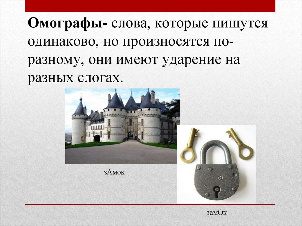 Омографы- слова, которые пишутсяодинаково, но произносятся поразному, они имеют ударение на