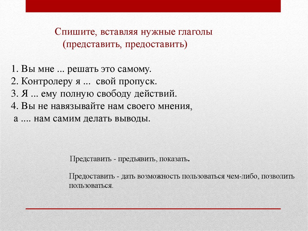 Спишите, вставляя нужные глаголы(представить, предоставить)