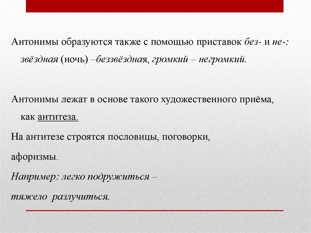 Антонимы образуются также с помощью приставок без- и не-:звёздная (ночь) –беззвёздная, громкий – негромкий.