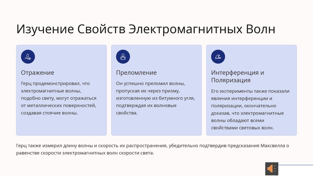 Герц также измерил длину волны и скорость их распространения, убедительно подтвердив предсказания Максвелла о