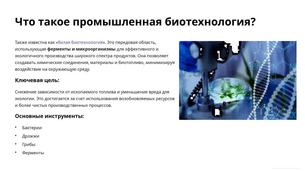 Что такое промышленная биотехнология?Также известна как «белая биотехнология». Это передовая область,
