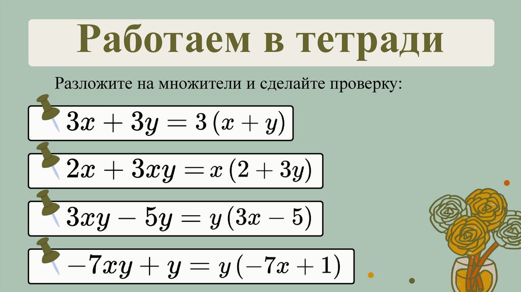 Работаем в тетрадиРазложите на множители и сделайте проверку: