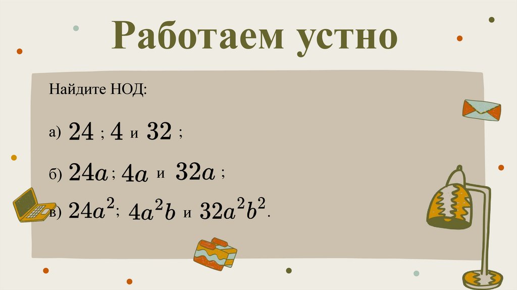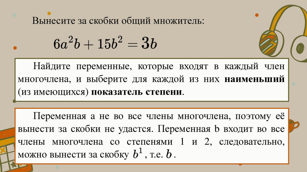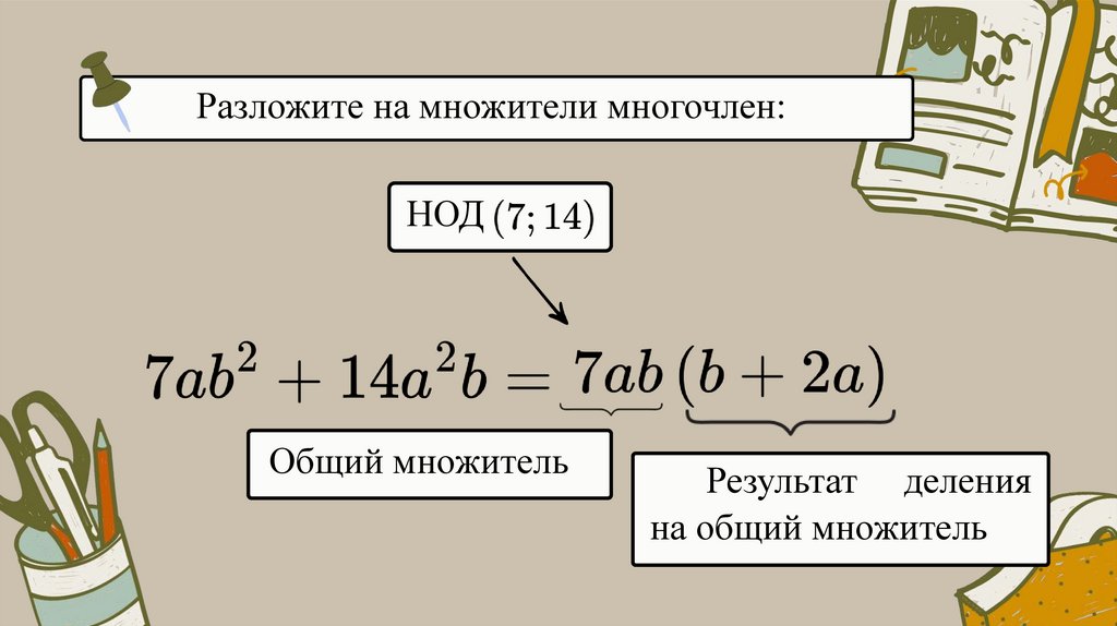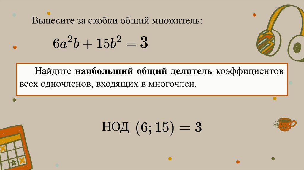Вынесите за скобки общий множитель:Найдите наибольший общий делитель коэффициентов