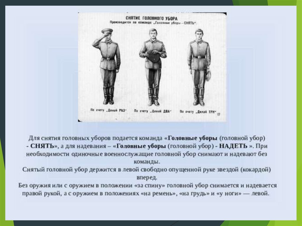уборы (головной убор) – снять (надеть)».