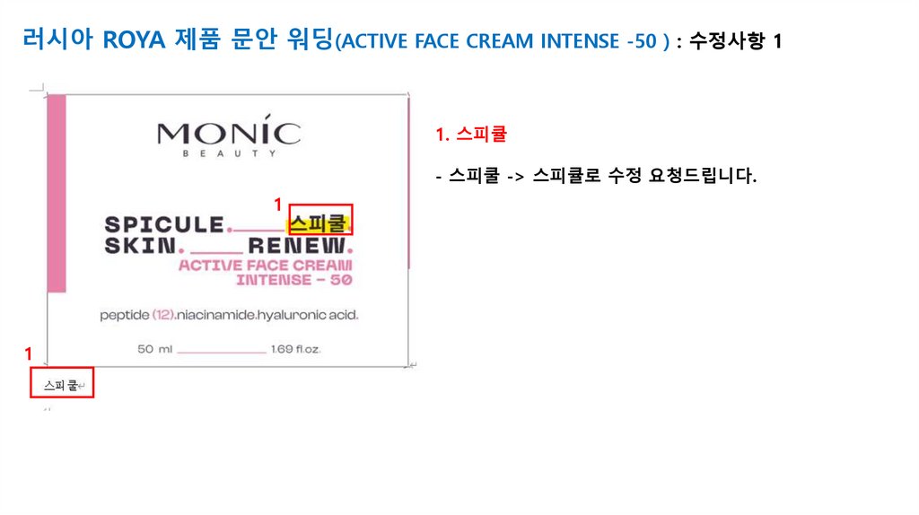 러시아 ROYA 제품 문안 워딩(ACTIVE FACE CREAM INTENSE -50 ) : 수정사항 11. 스피큘