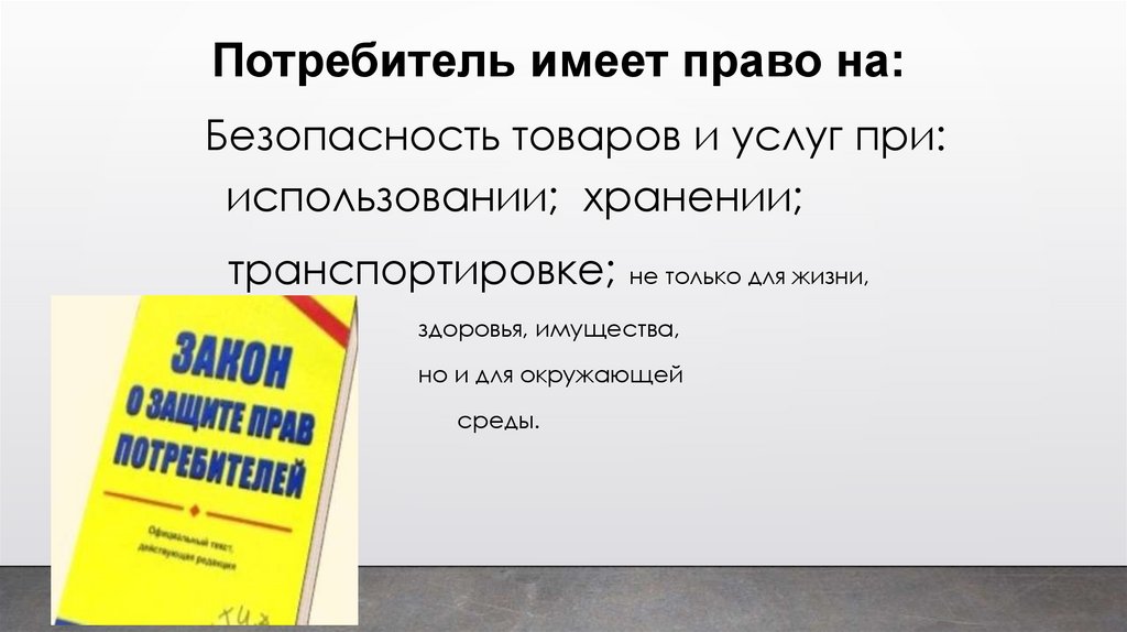 Потребитель имеет право на:Безопасность товаров и услуг при: