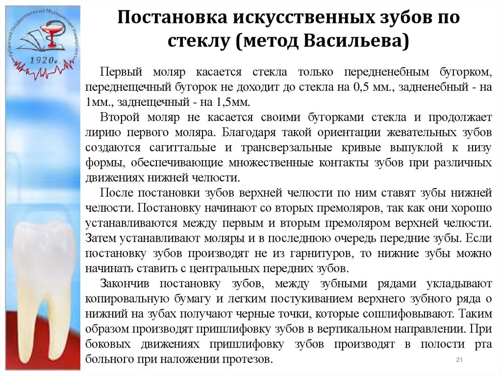 этой методике, боковые зубы в/ч ставят следующим образом: первый