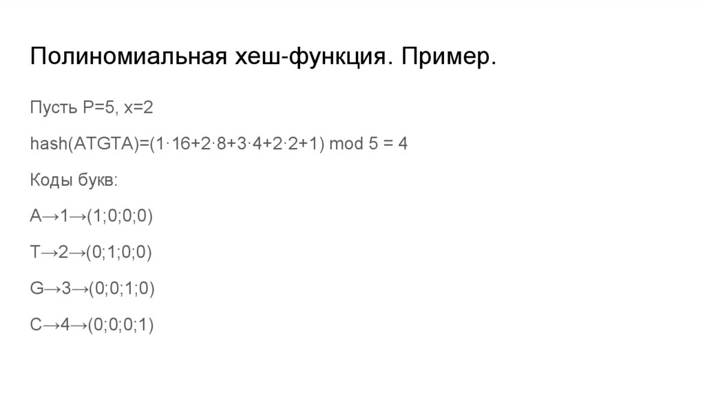 Полиномиальная хеш-функция. Пример.Пусть P=5, x=2