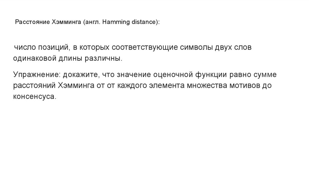 Расстояние Хэмминга (англ. Hamming distance):число позиций, в которых соответствующие символы двух слов