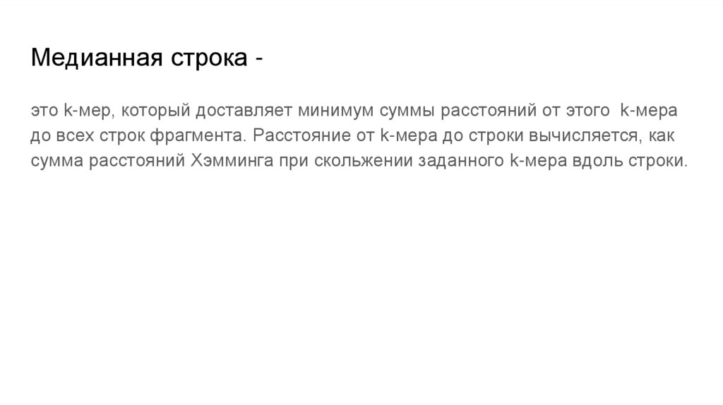 Медианная строка это k-мер, который доставляет минимум суммы расстояний от этого k-мерадо всех строк фрагмента. Расстояние от k-мера до строки вычисляется, как