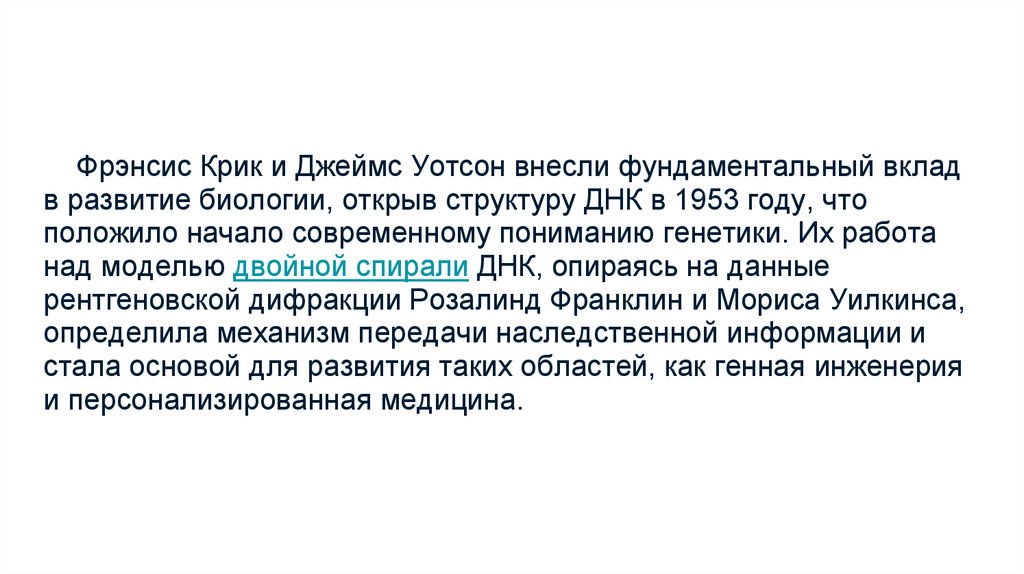 Фрэнсис Крик и Джеймс Уотсон внесли фундаментальный вкладв развитие биологии, открыв структуру ДНК в 1953 году, что