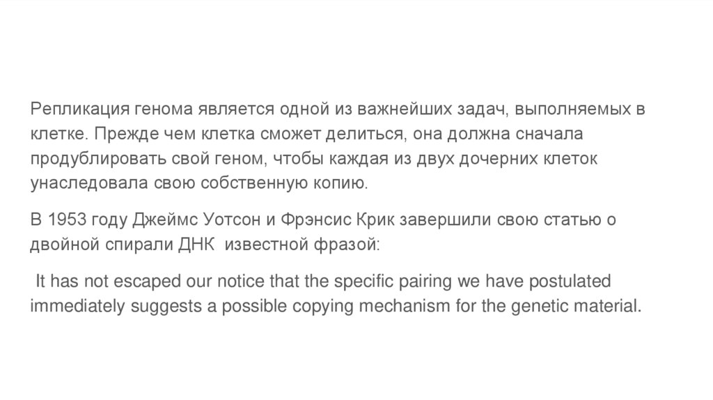 Репликация генома является одной из важнейших задач, выполняемых вклетке. Прежде чем клетка сможет делиться, она должна сначала