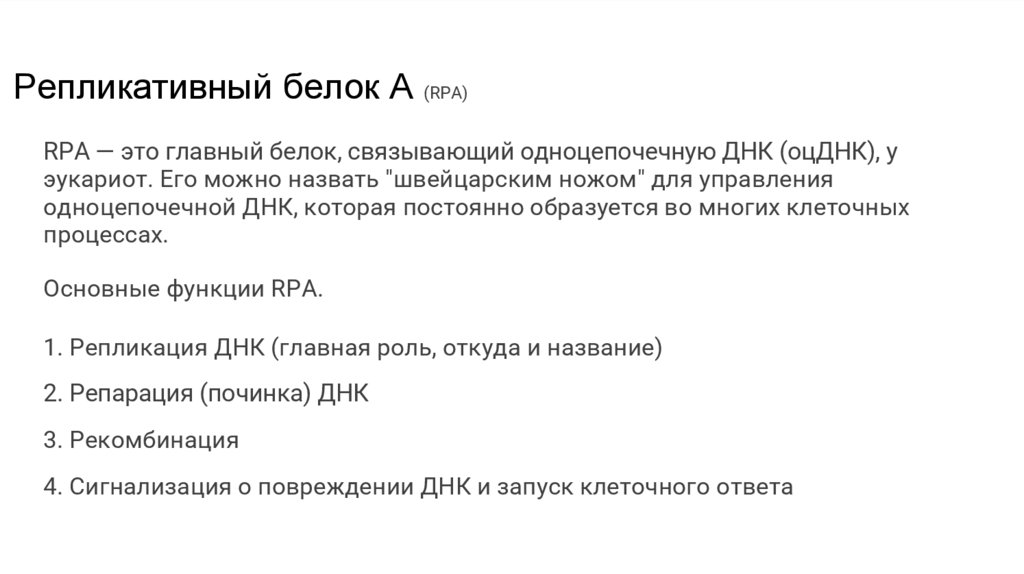 Репликативный белок А (RPA)RPA — это главный белок, связывающий одноцепочечную ДНК (оцДНК), у