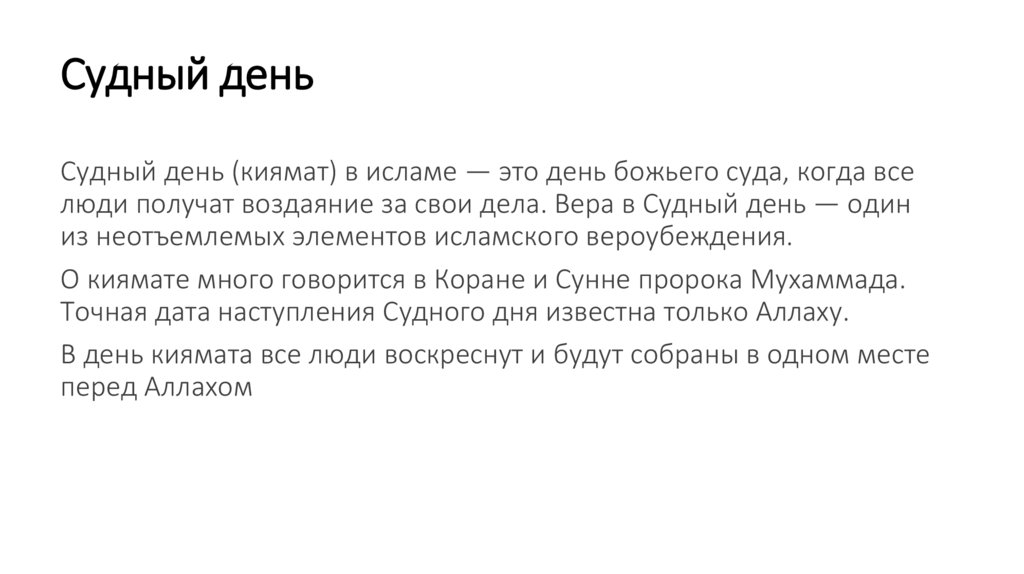 Судный деньСудный день (киямат) в исламе — это день божьего суда, когда все