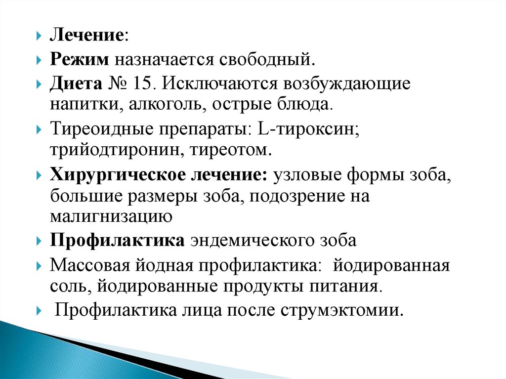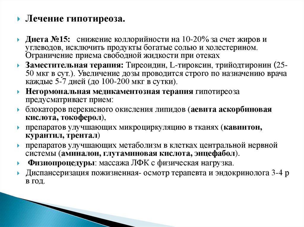 Лечение гипотиреоза.Диета №15: снижение коллорийности на 10-20% за счет жиров и
