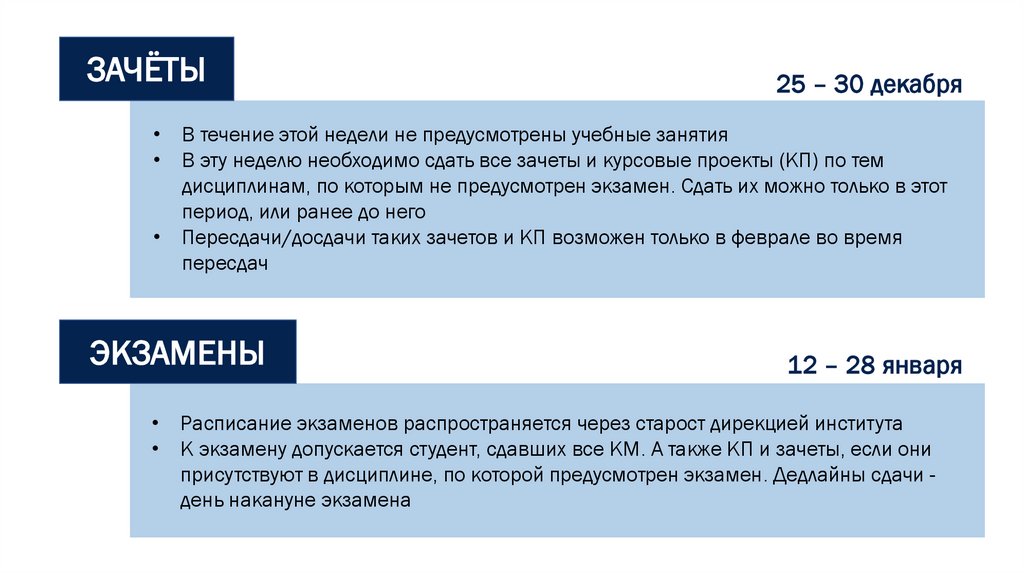 • Пересдачи/досдачи таких зачетов и КП возможен только в феврале во время