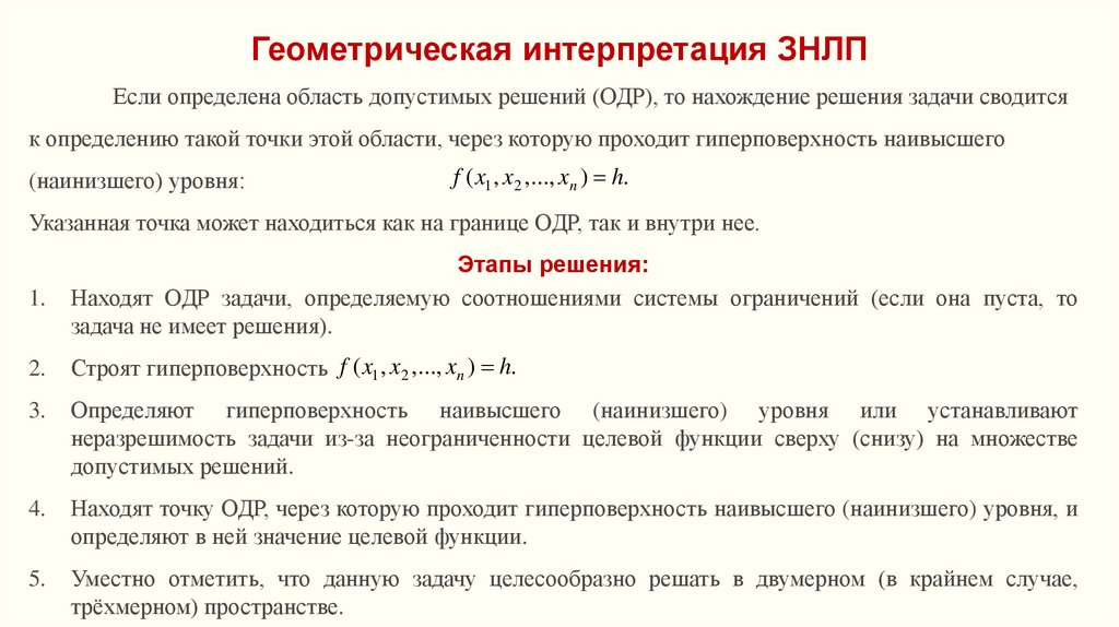Геометрическая интерпретация ЗНЛПЕсли определена область допустимых решений (ОДР), то нахождение решения задачи сводится