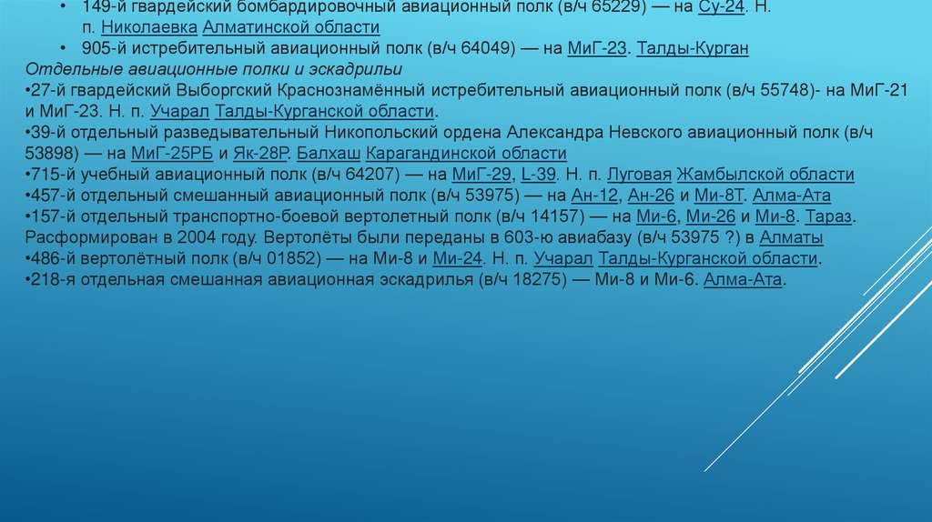 • 149-й гвардейский бомбардировочный авиационный полк (в/ч 65229) — на Су-24. Н.п. Николаевка Алматинской области