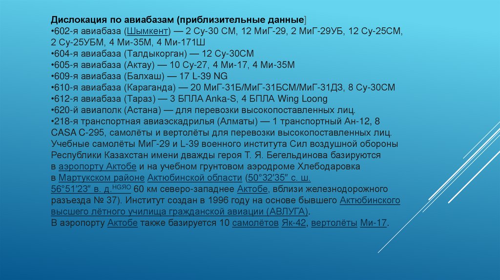 Дислокация по авиабазам (приблизительные данные]•602-я авиабаза (Шымкент) — 2 Су-30 СМ, 12 МиГ-29, 2 МиГ-29УБ, 12 Су-25СМ,