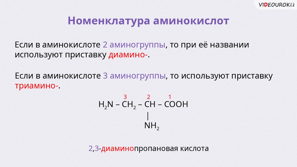 Номенклатура аминокислотЕсли в аминокислоте 2 аминогруппы, то при её названии