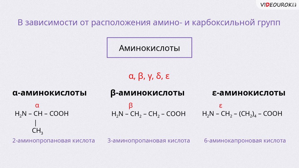 В зависимости от расположения амино- и карбоксильной группАминокислоты
