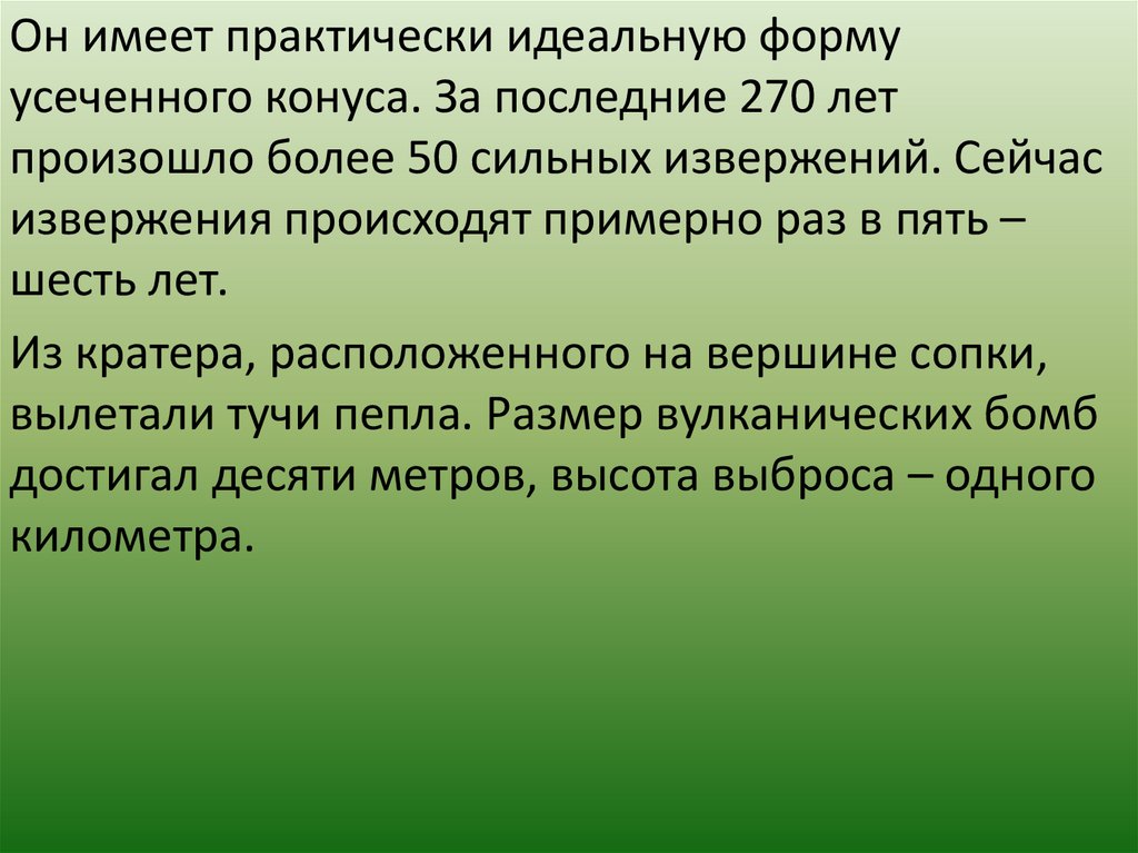 Он имеет практически идеальную формуусеченного конуса. За последние 270 лет