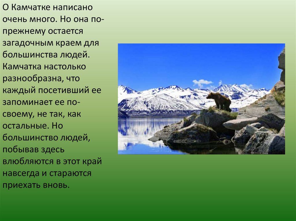 • Камчатка по праву считается одним из самыхэкзотических мест на свете. Это уникальный