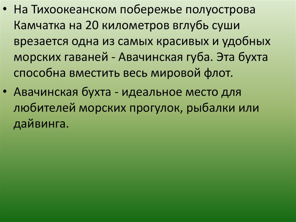 • На Тихоокеанском побережье полуостроваКамчатка на 20 километров вглубь суши