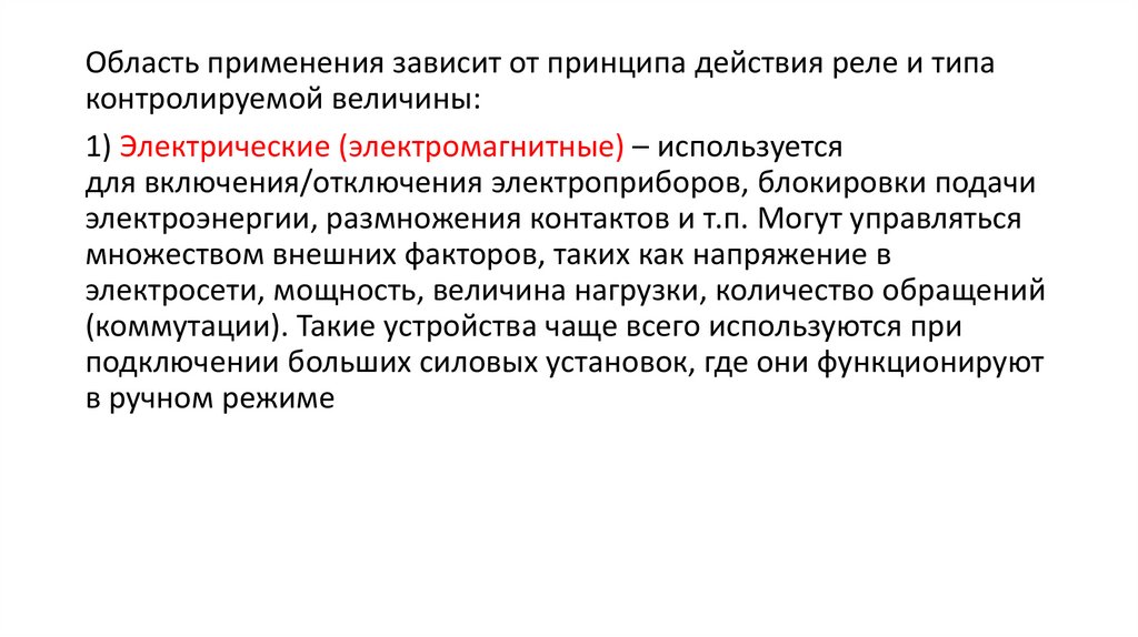 Область применения зависит от принципа действия реле и типаконтролируемой величины: