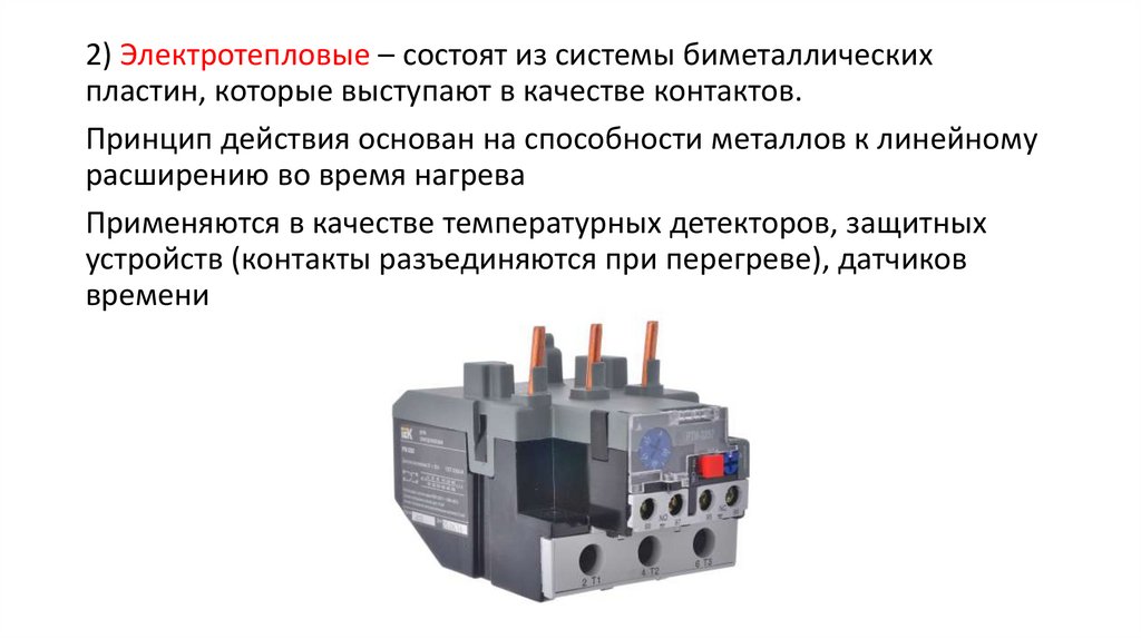 2) Электротепловые – состоят из системы биметаллическихпластин, которые выступают в качестве контактов.