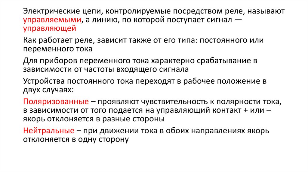 Поляризованные – проявляют чувствительность к полярности тока,