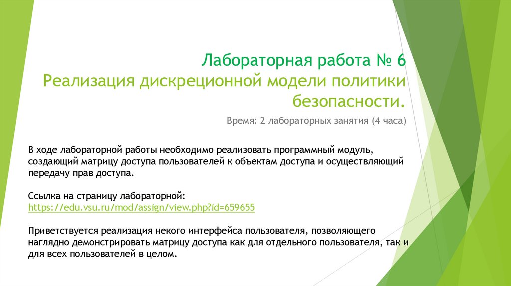 Время: 2 лабораторных занятия (4 часа)В ходе лабораторной работы необходимо реализовать программный модуль,